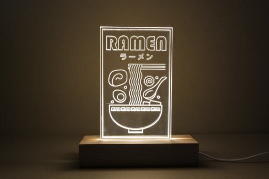看板、記念品、案内板、イラストなど目的に応じたデザインをアクリルボードに施します。ライトスタンドが付属しているので、お手元のスイッチを入れることで光り輝きます。